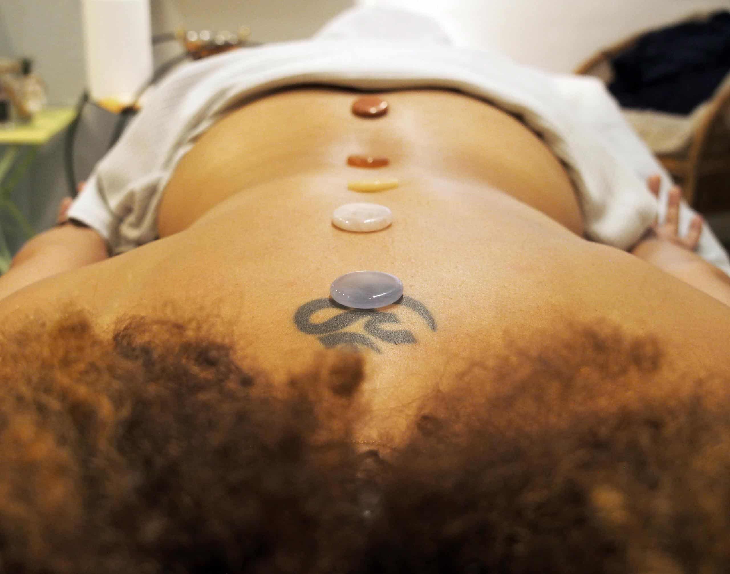 - massage lithothérapeutique : aux cristaux : quartz rose et galets d'améthyste avec une huile naturelle à base de propolis, ou huile parfumée, ou huile végétale mélangée à des cristaux ou des huiles essentielles