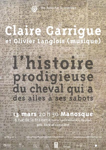 Claire Garrigue, conteuse, chanteuse et comédienne, se produit sur scène depuis vingt ans avec des créations originales nourries des contes et mythologies de la mémoire du monde. Son parcours artistique s’est construit autour du travail de la voix. Sensible à la poésie contenue dans les répertoires contés et chantés traditionnels, ce sont certaines de ces histoires qui lui ont donné les ailes nécessaires pour devenir une « raconteuse de contes ».