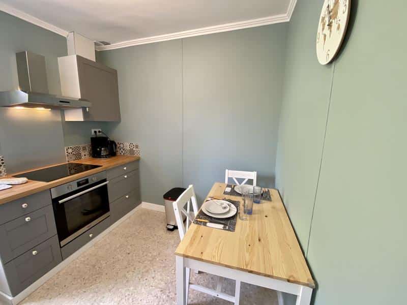 Une superbe cuisine indépendante haut de gamme entièrement équipée, avec une table et chaises pour vos repas.