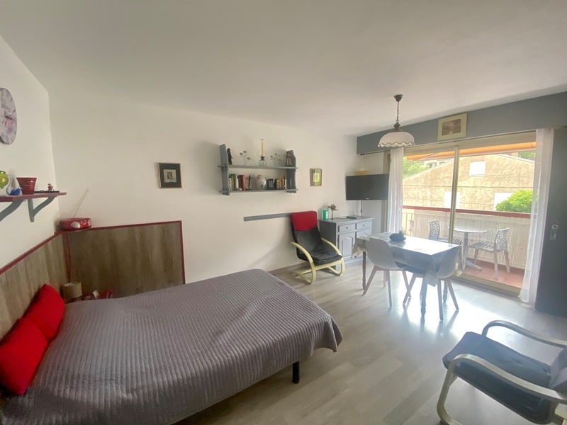 Séjour lumineux avec balcon exposé ouest, un Lit en 140, deux fauteuils de relaxations.