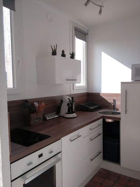 Cuisine séparée non fermée, avec plaque vitrocéramique, four micro-ondes, four, réfrigérateur et congélateur silencieux, équipée : cafetière classique et cafetière Senseo, bouilloire, grille pain....