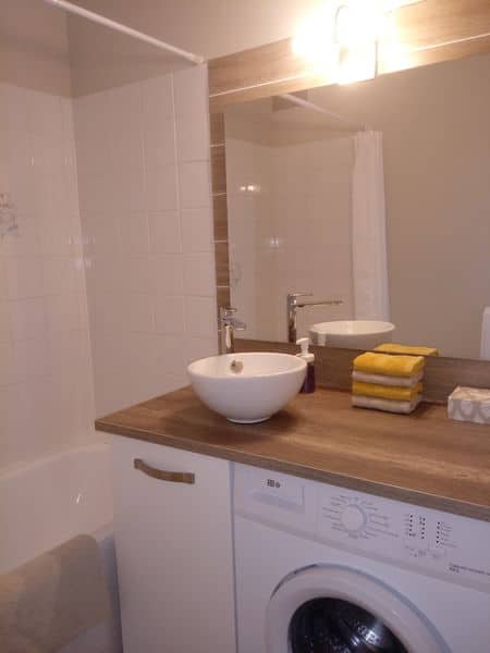 Salle de Bains avec Lave Linge, fer et table à repasser, sèche cheveux. Toilettes séparés.