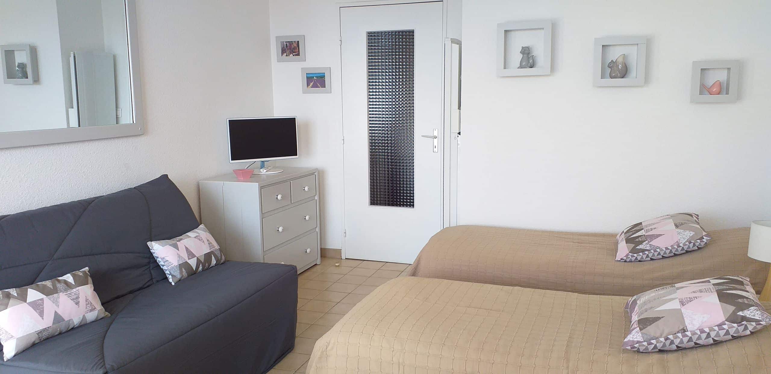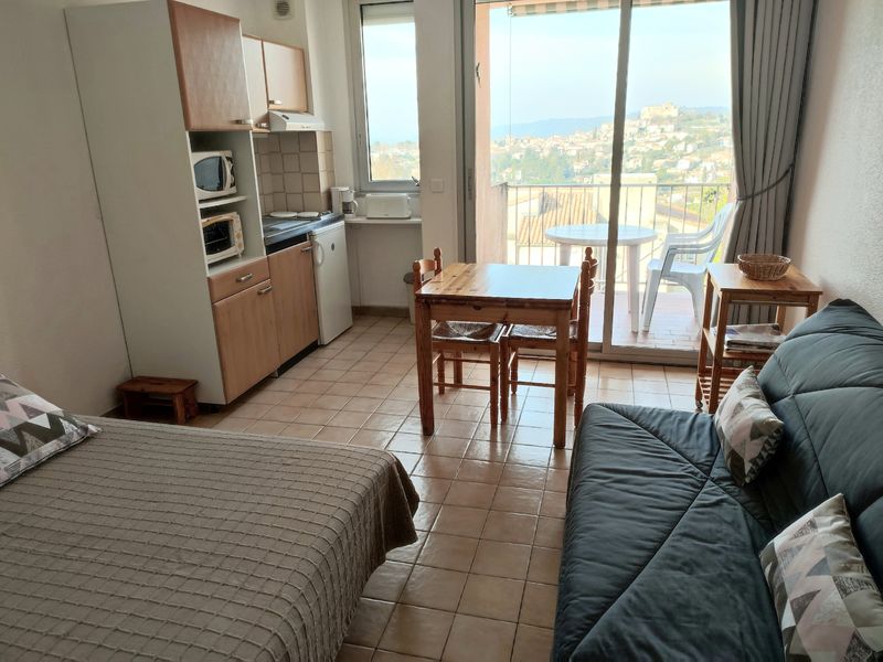 Le studio se compose d'un coin cuisine, d'un séjour avec 2 lits de 1 personne et un canapé, d'une salle de bain avec baignoire, WC séparé, d'un balcon avec salon de jardin (belle vue sur le château). Exposition sud.
