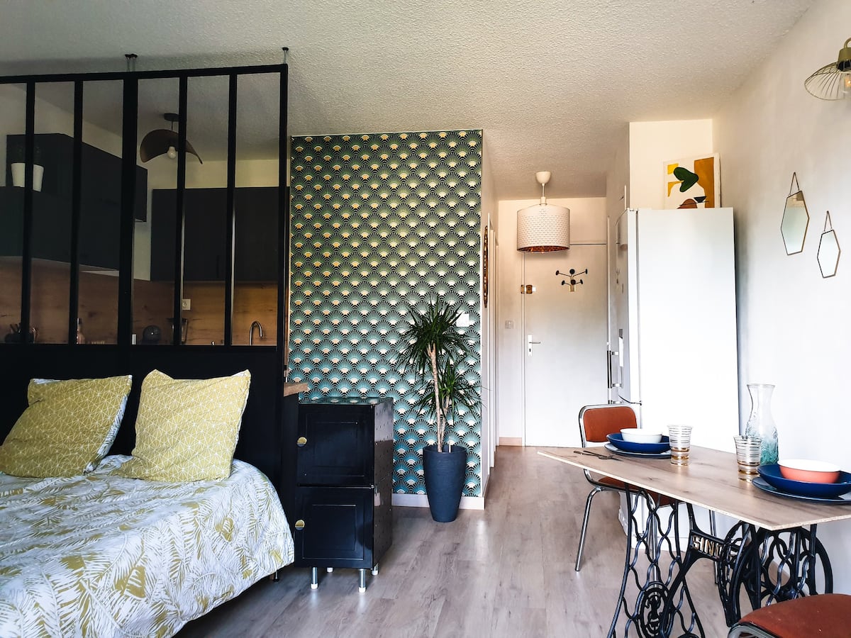 ** un séjour avec un lit double de 140*200, TV à écran plat.