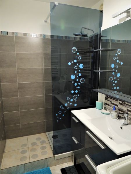 - Salle d'eau avec douche à l’italienne, lave-linge, étendage, sèche serviettes, sèche-cheveux