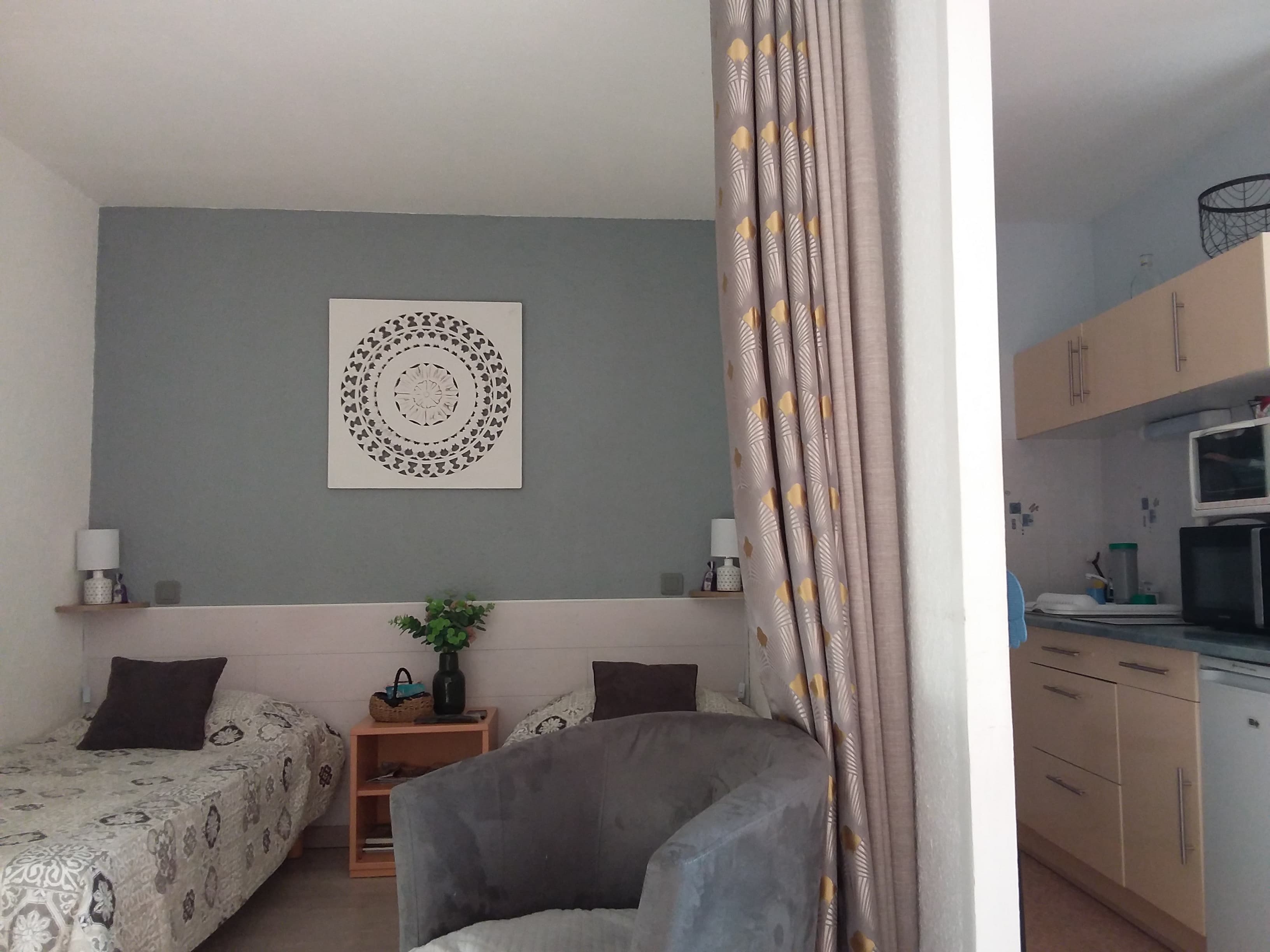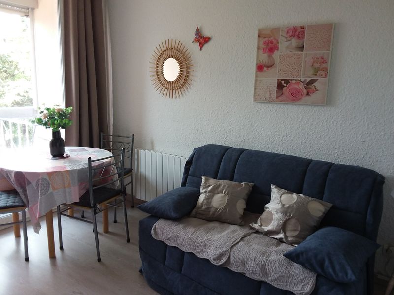 À 800 mètres des thermes (les hautes plaines), 150 mètres des commerces (Vival). Bien équipé : grand placard d'entrée, 2 lits de 90, 2 fauteuils, TV, plaques vitro céramiques, 2 fours ( 1 micro-ondes), Senseo, grille pain, mixeur, frigo et son congélateur. Oreillers et couvertures fournis, alèses changées après chaque départ , balcon équipé table, chaises, étendage.