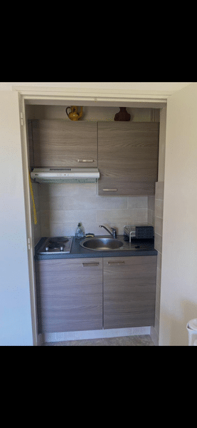 Cuisine neuve : placard haut et bas + Grille pain + bouilloire + plaque électrique deux foyers + barbecue extérieur ou intérieur électrique + micro-ondes+ frigo + congélo +