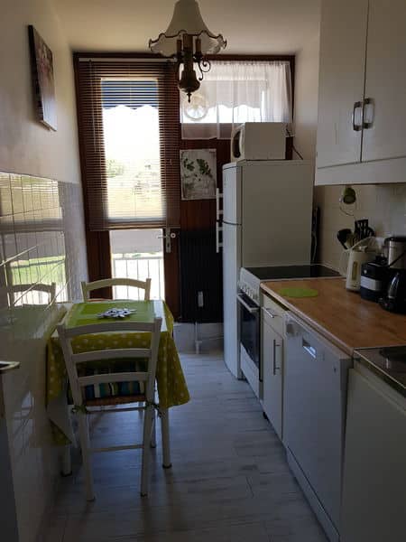 La cuisine donne sur le balcon et est équipée d'un frigo-congélateur, plaque vitrocéramiques, lave vaisselle, et tout les petits électro-ménagés et la vaisselle.