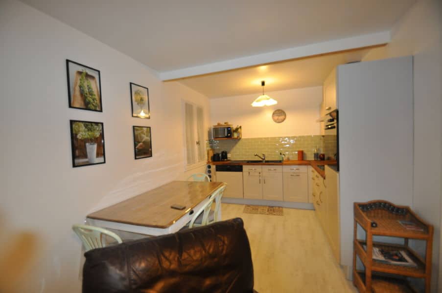 Cuisine équipée ouverte sur séjour (lave-vaisselle, four, plaque vitrocéramique, four mico-onde, grille pain, bouilloire, cafetière, congélateur 32l)