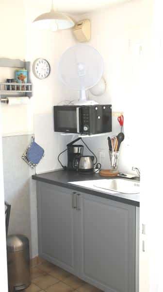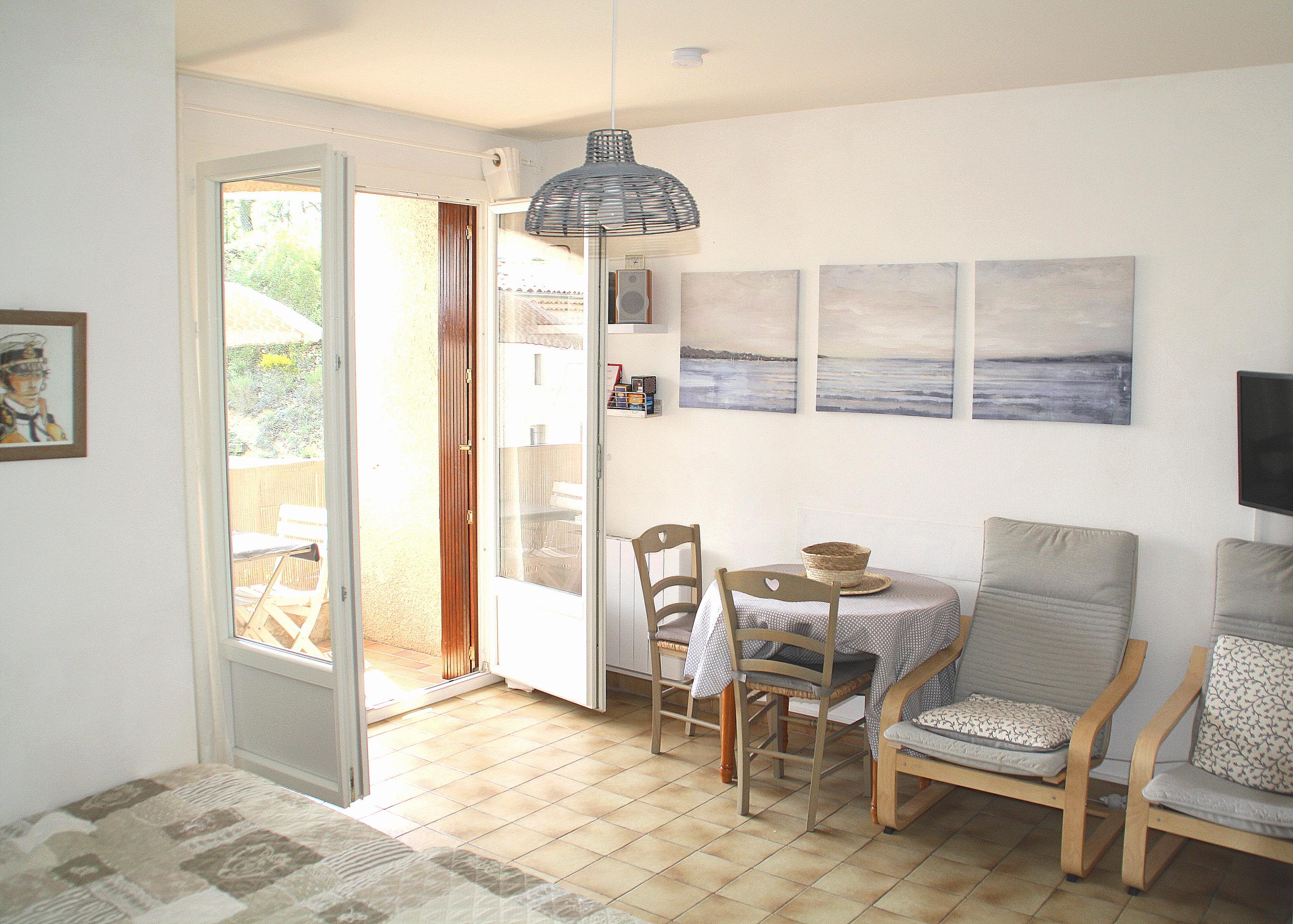 Un salon télé (wifi gratuit) avec coin nuit (2 lits de 90) et placard; une cuisine séparée parfaitement équipée; une salle de bain munie d’une douche d’un lavabo ainsi que d’un lave-linge; WC séparés; enfin, un petit balcon exposé sud, donc très lumineux, pour les petits déjeuners du matin.