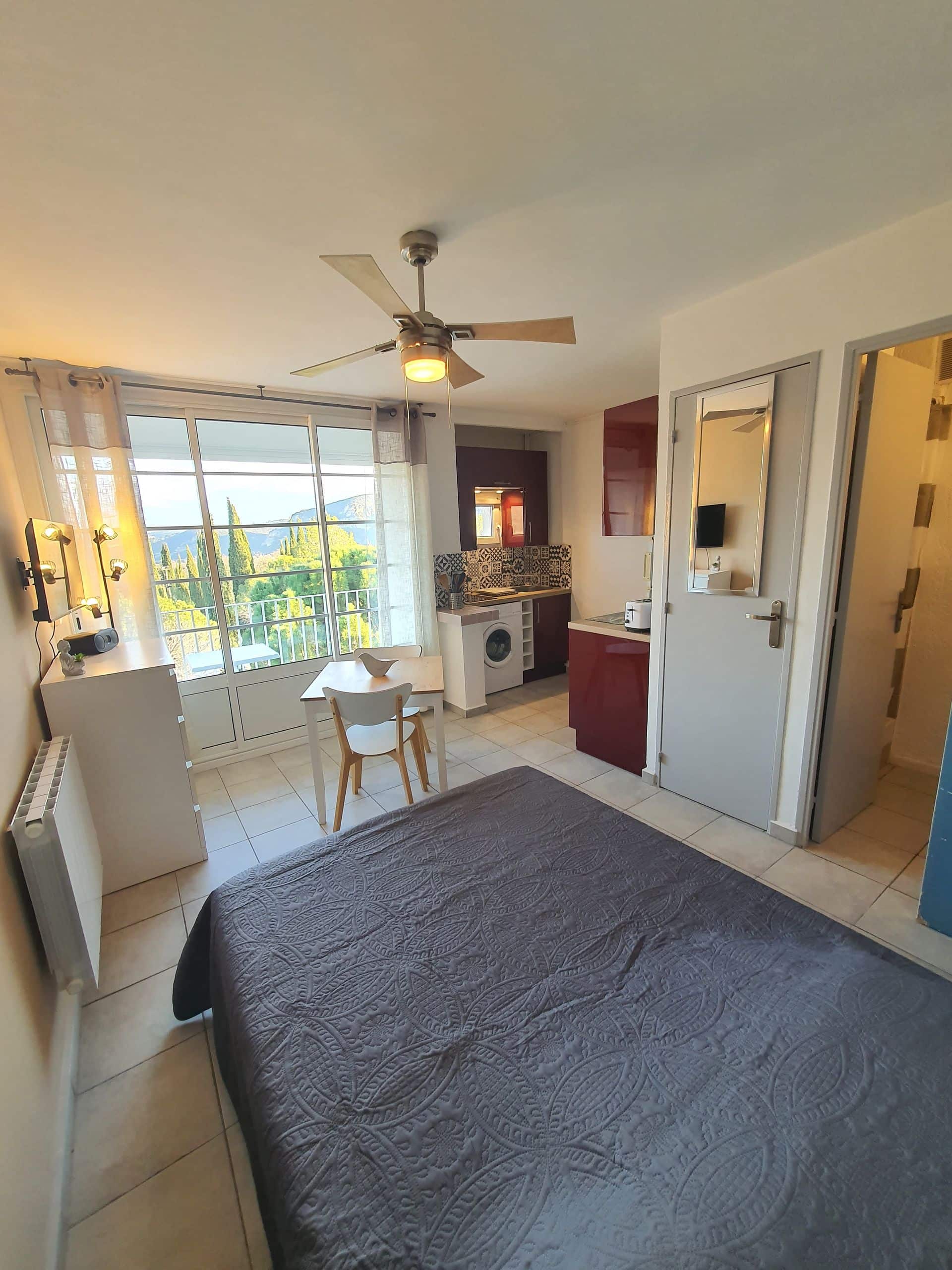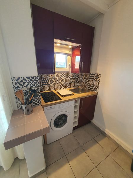 Studio équipé d'un lave linge, d'une plaque à induction, d'une télé, d'un réfrigérateur avec une partie congélateur, ...