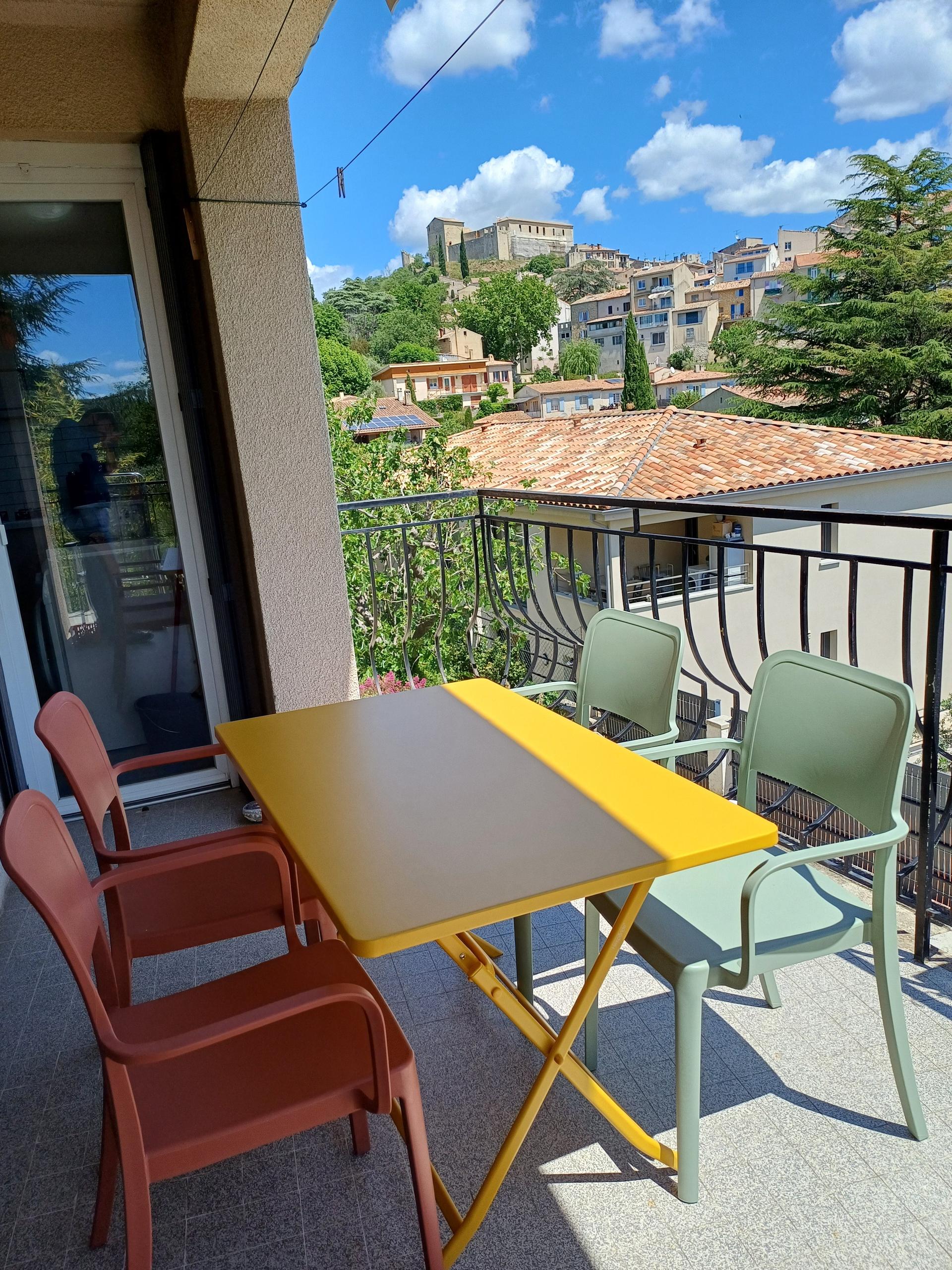 Au deuxième étage d’une maison individuelle, lumineux T3 de 80m² climatisé et rénové en 2023 avec grand balcon et belle vue sur le château de Gréoux-Les-Bains.