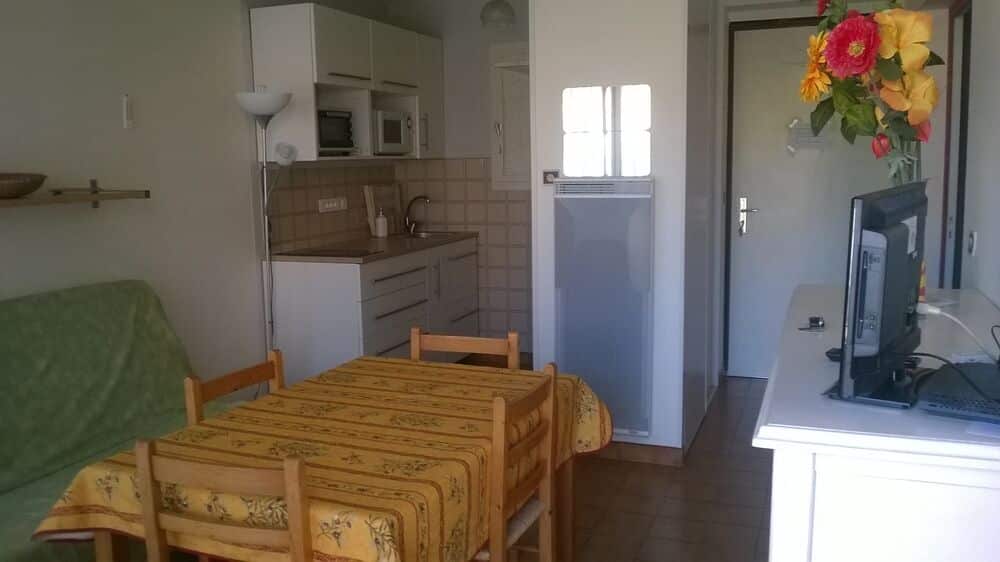T2 de 32 m² : une chambre avec deux lits de 90cm. Petite cuisine ouverte sur la pièce principale.