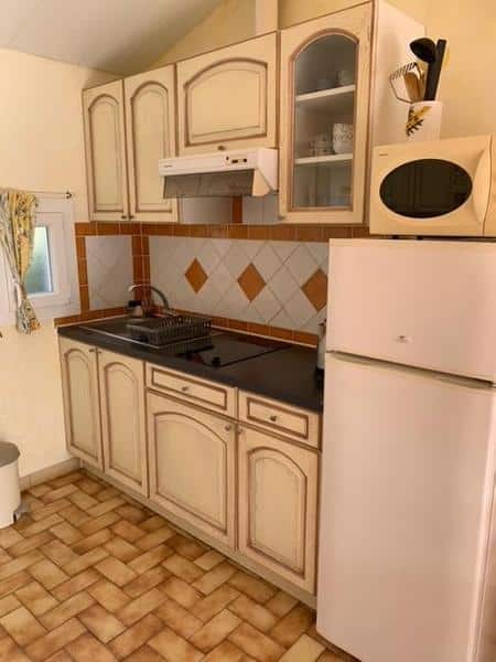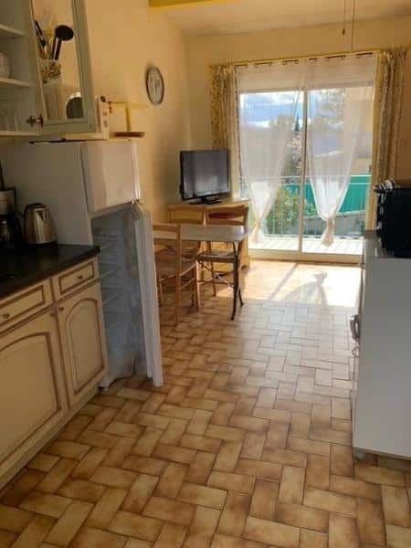 Studio de 26 m2 avec terrasse et balcon composé d'une pièce à vivre avec un lit en 140 un coin télé et une cuisine intégrée et un coin repas qui donne sur une terrasse avec salon de jardin et chaises longues.