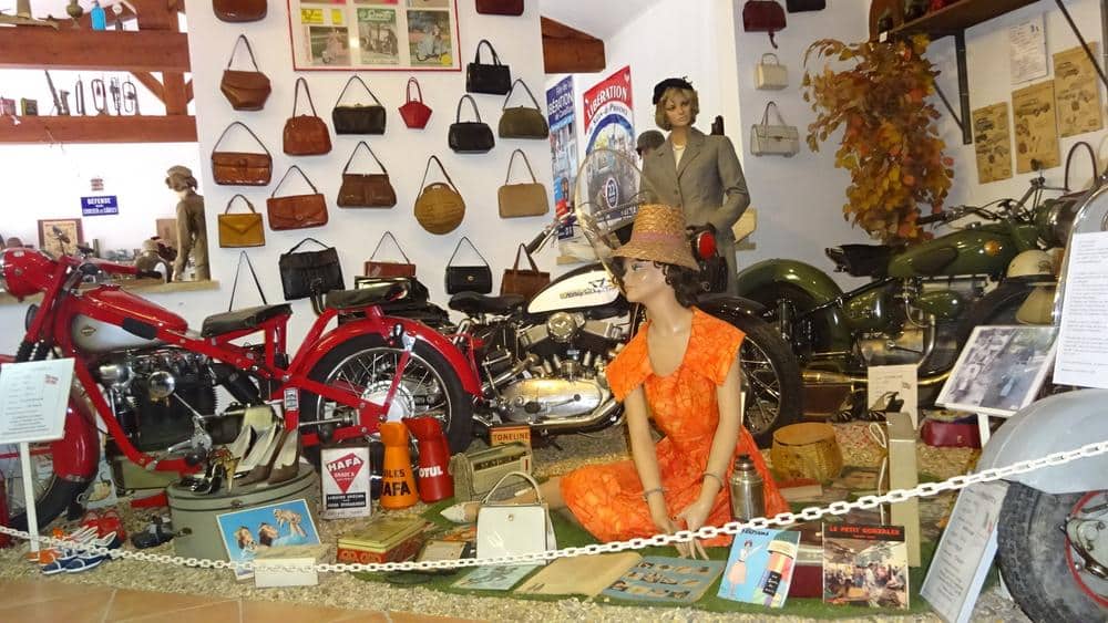 Motos civiles de 1900 à 1970, motos militaires de 14-18 et de 39-45 avec des uniformes et accessoires. Objets anciens sur la mode, robes chapeaux et chaussures ainsi que de nombreux éléments gravitant autour de ces thèmes